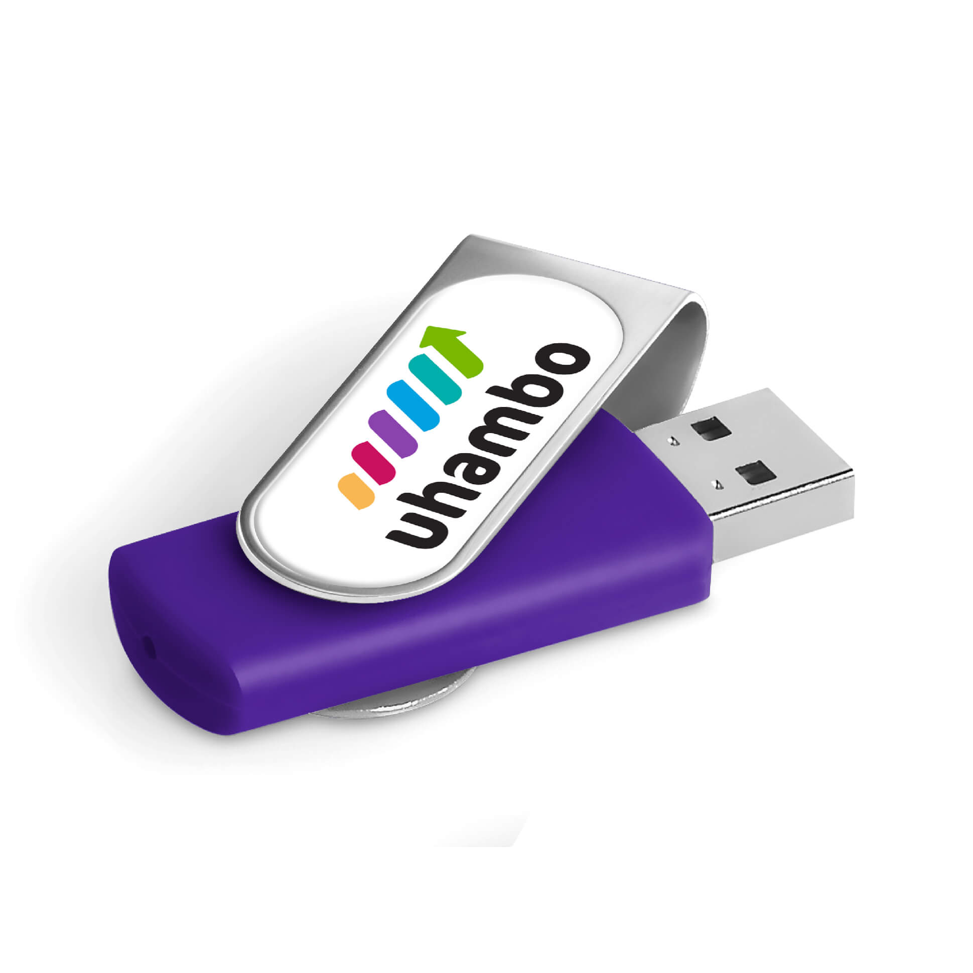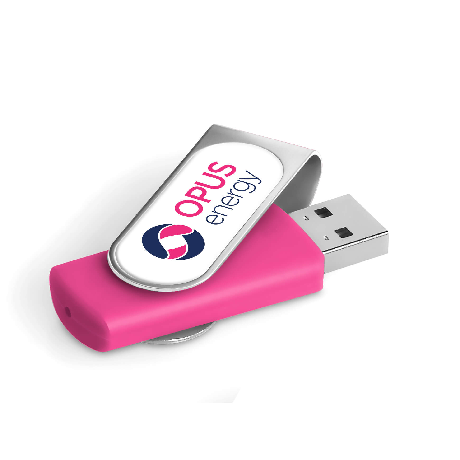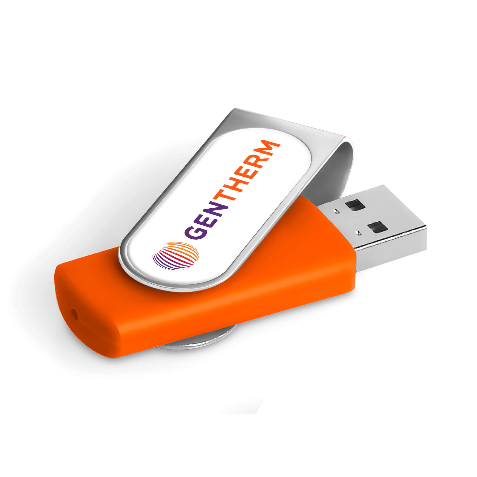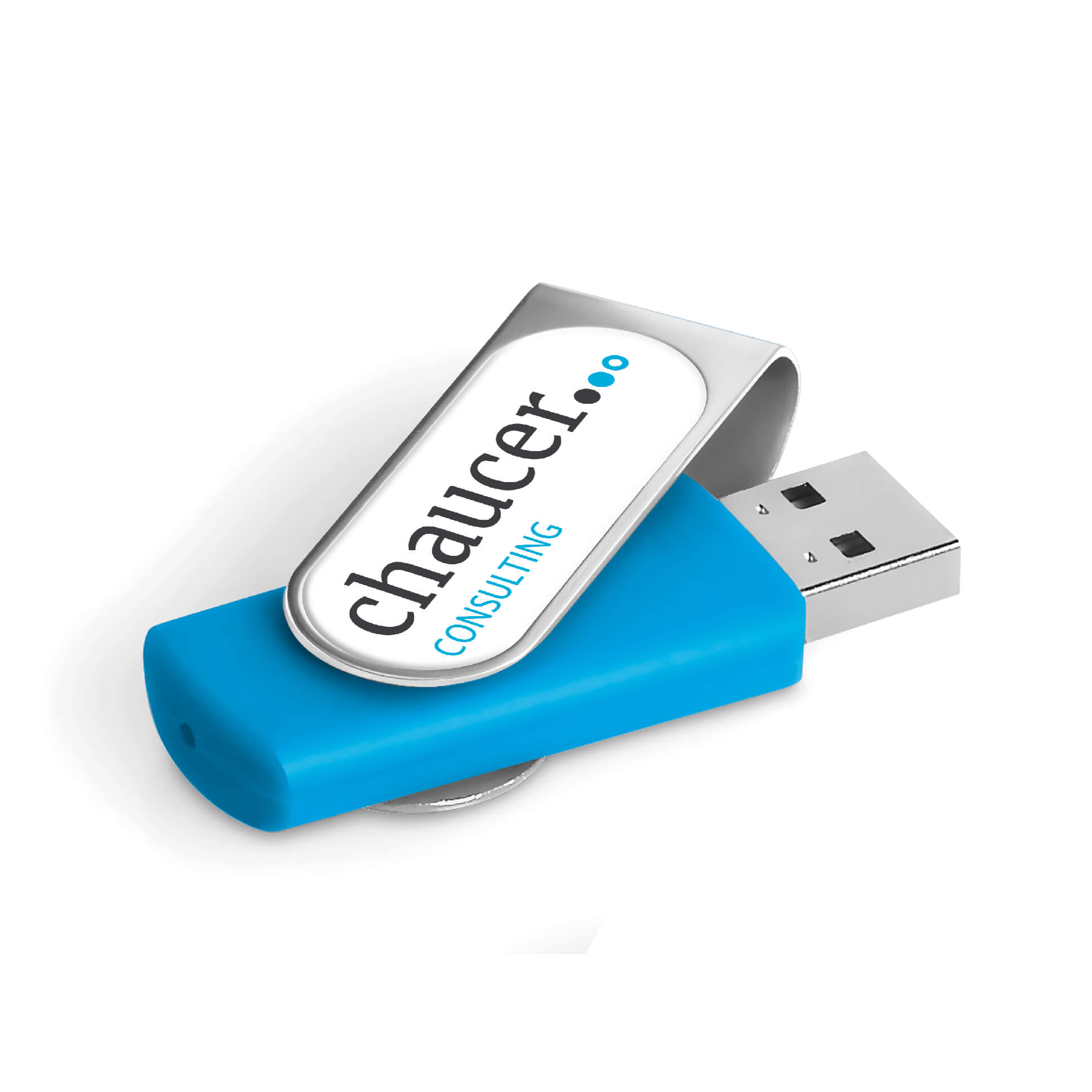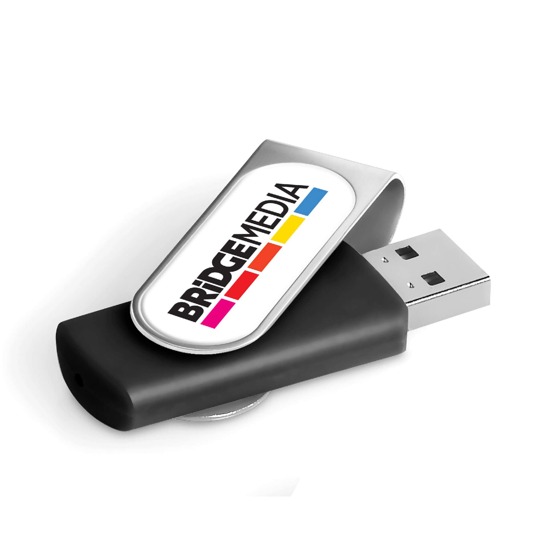Classic flash drive with a silver metal swivel and a soft touch lacquered base. The swivel is designed for vibrant, full-colour dome sticker branding which fits snugly into the recess. It has 16GB of memory, with a USB 2.0 interface.