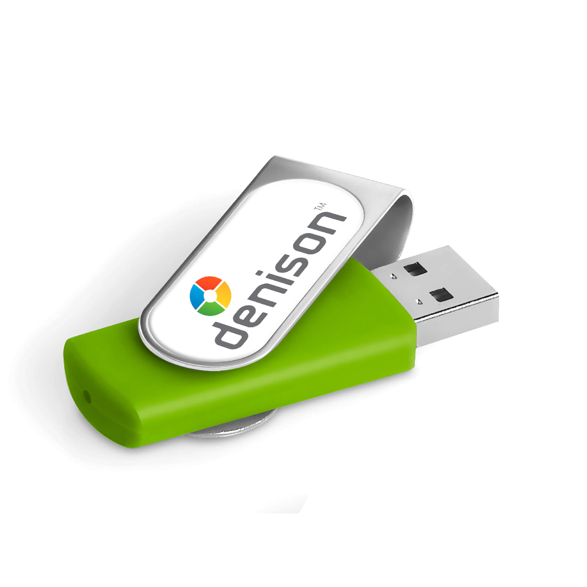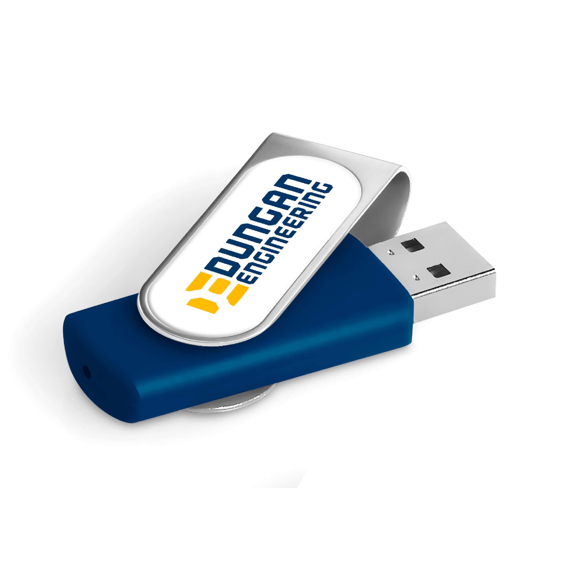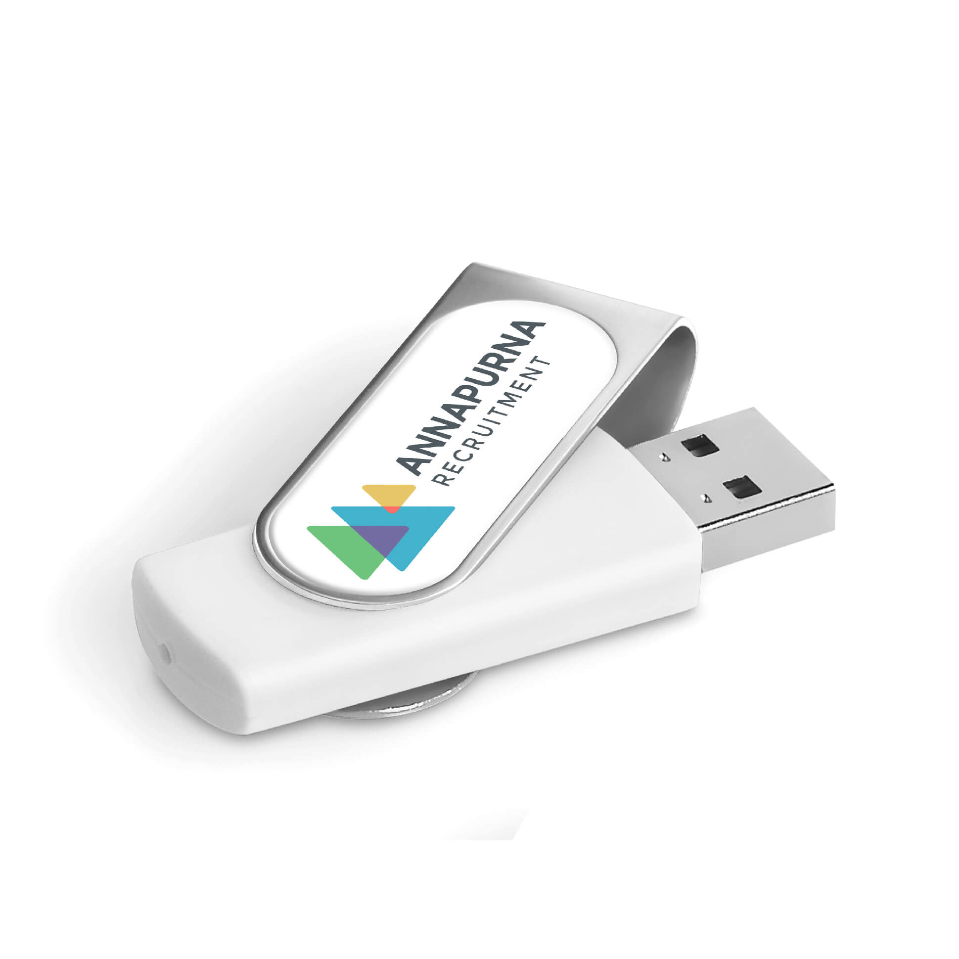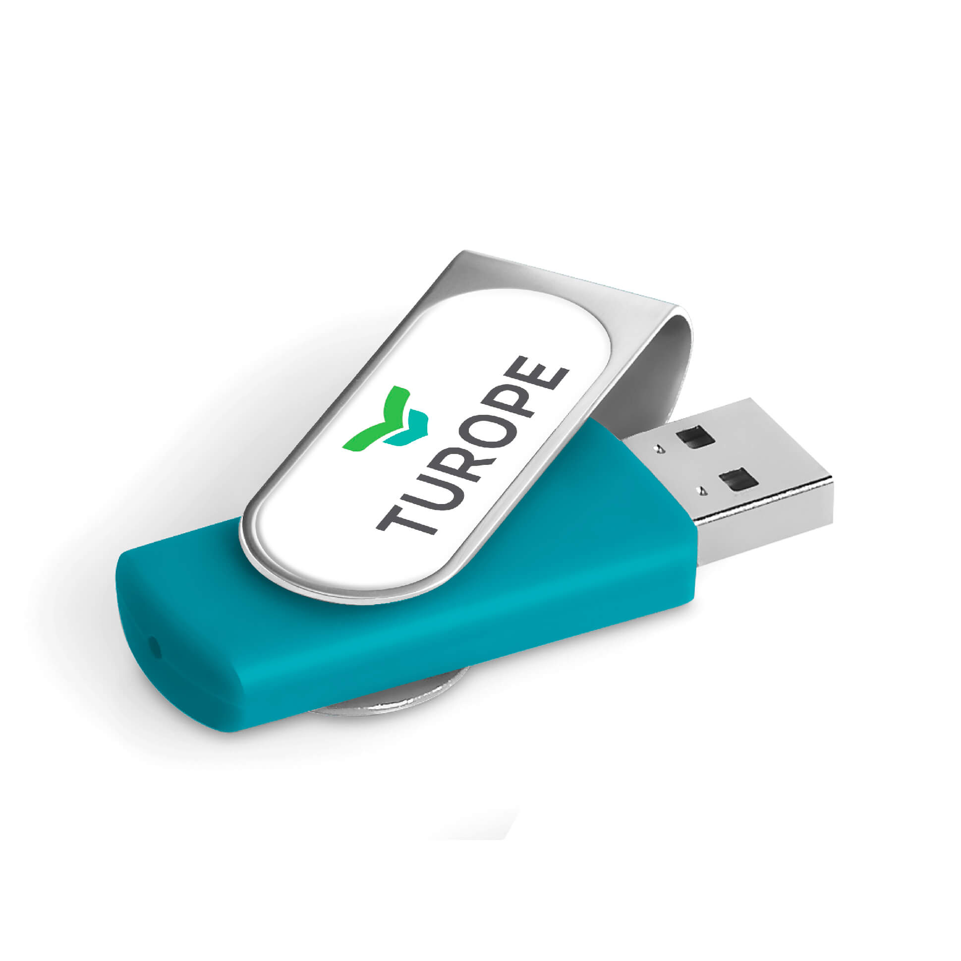 Classic flash drive with a silver metal swivel and a soft touch lacquered base. The swivel is designed for vibrant, full-colour dome sticker branding which fits snugly into the recess. It has 16GB of memory, with a USB 2.0 interface.