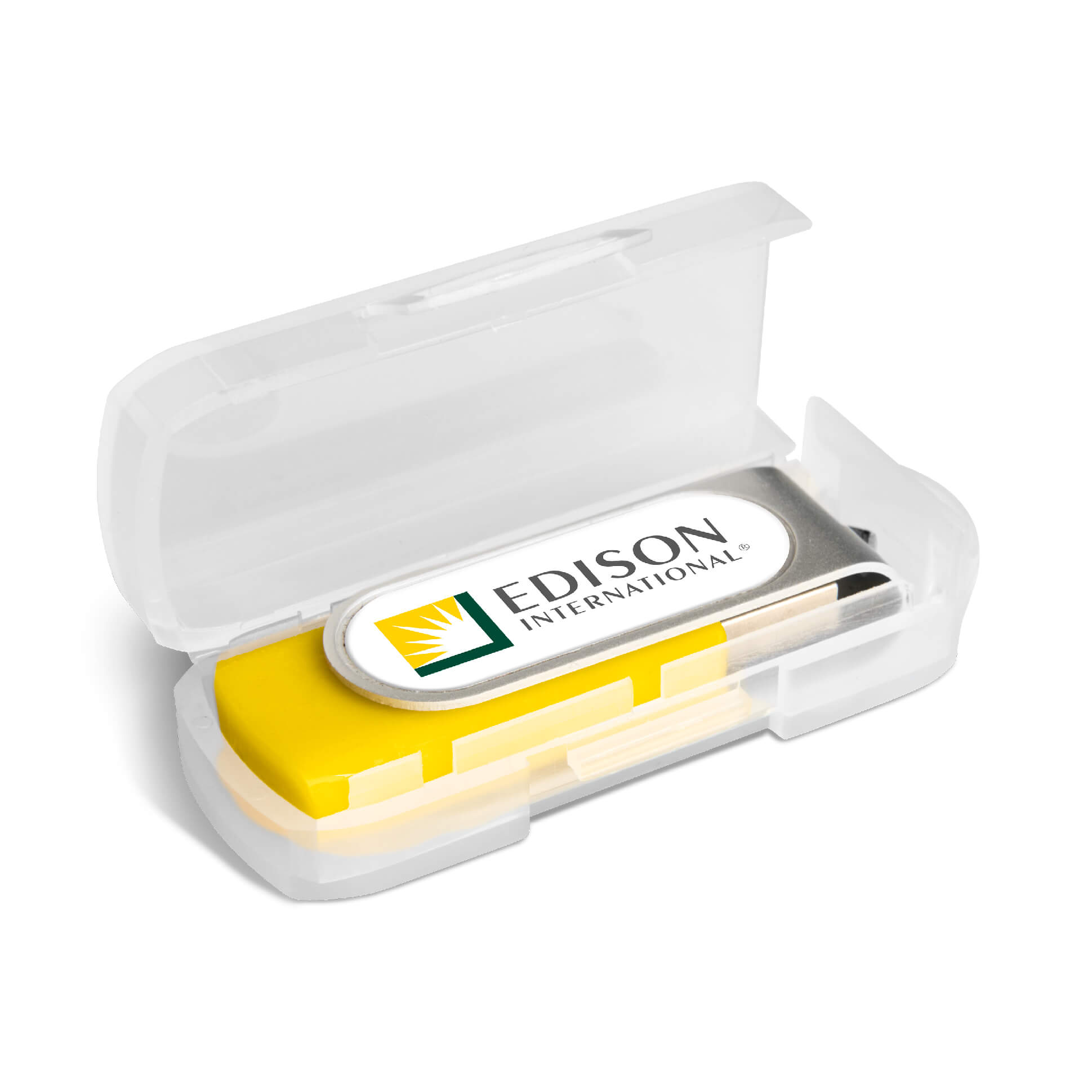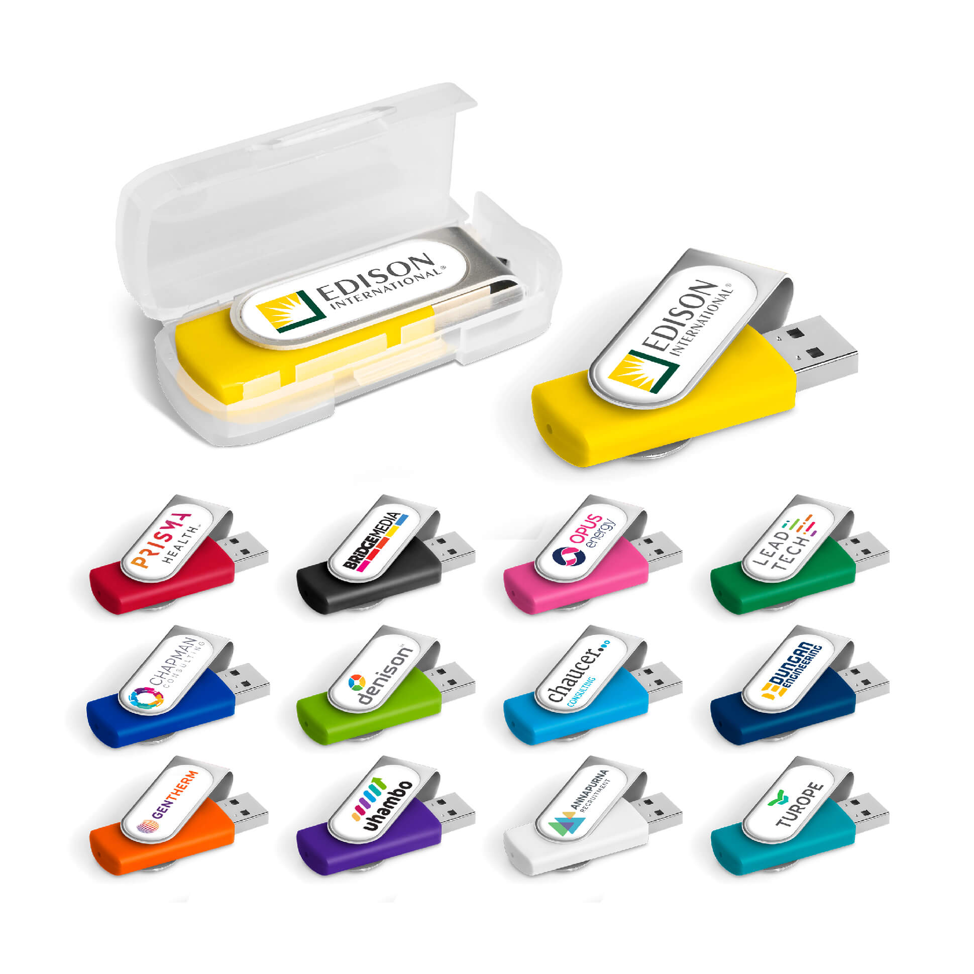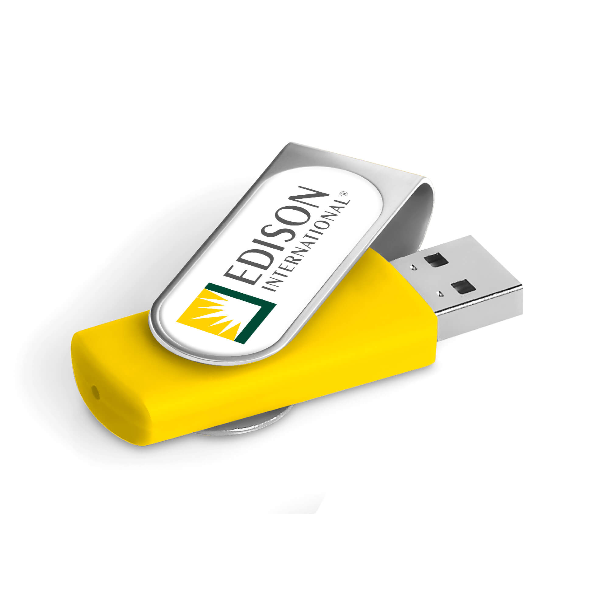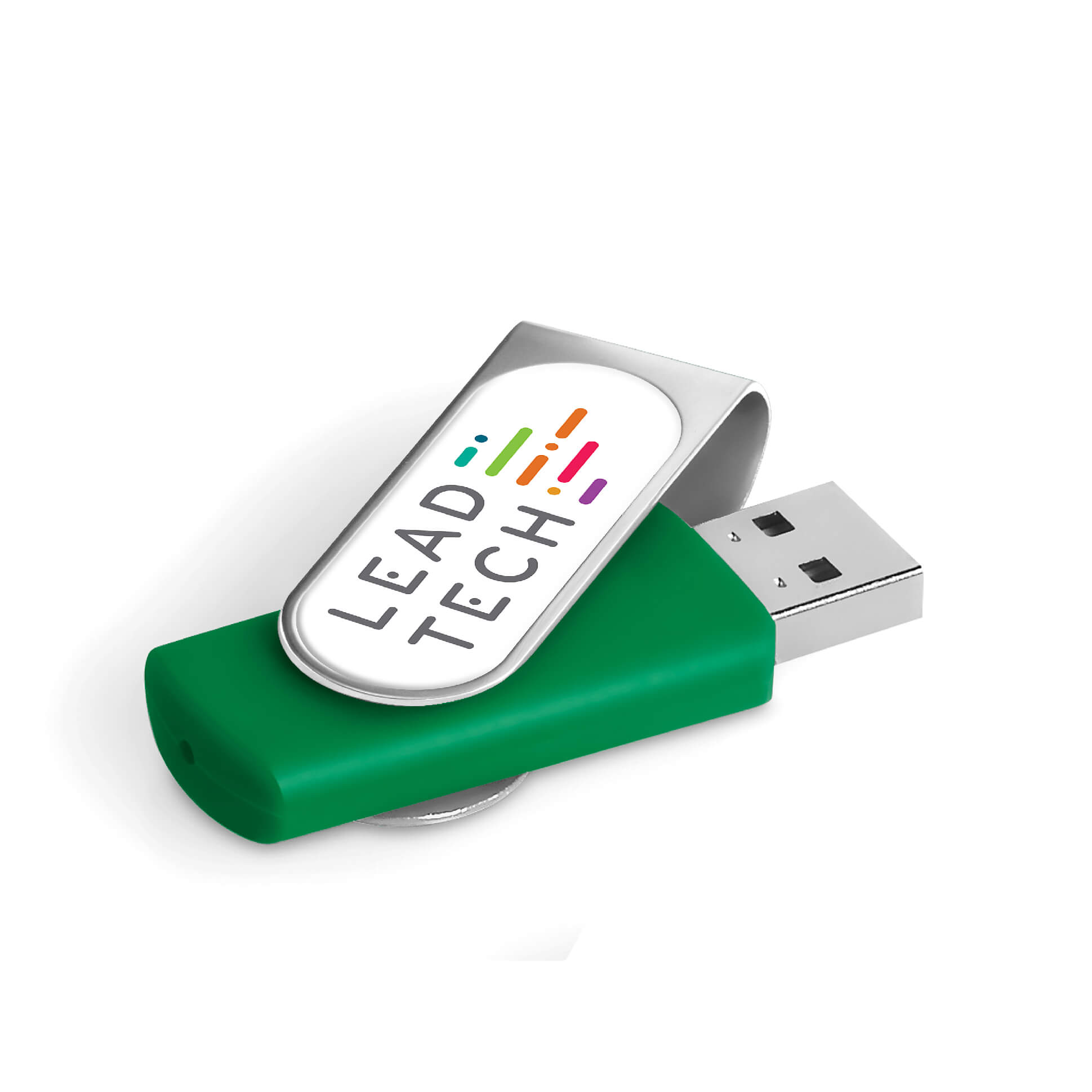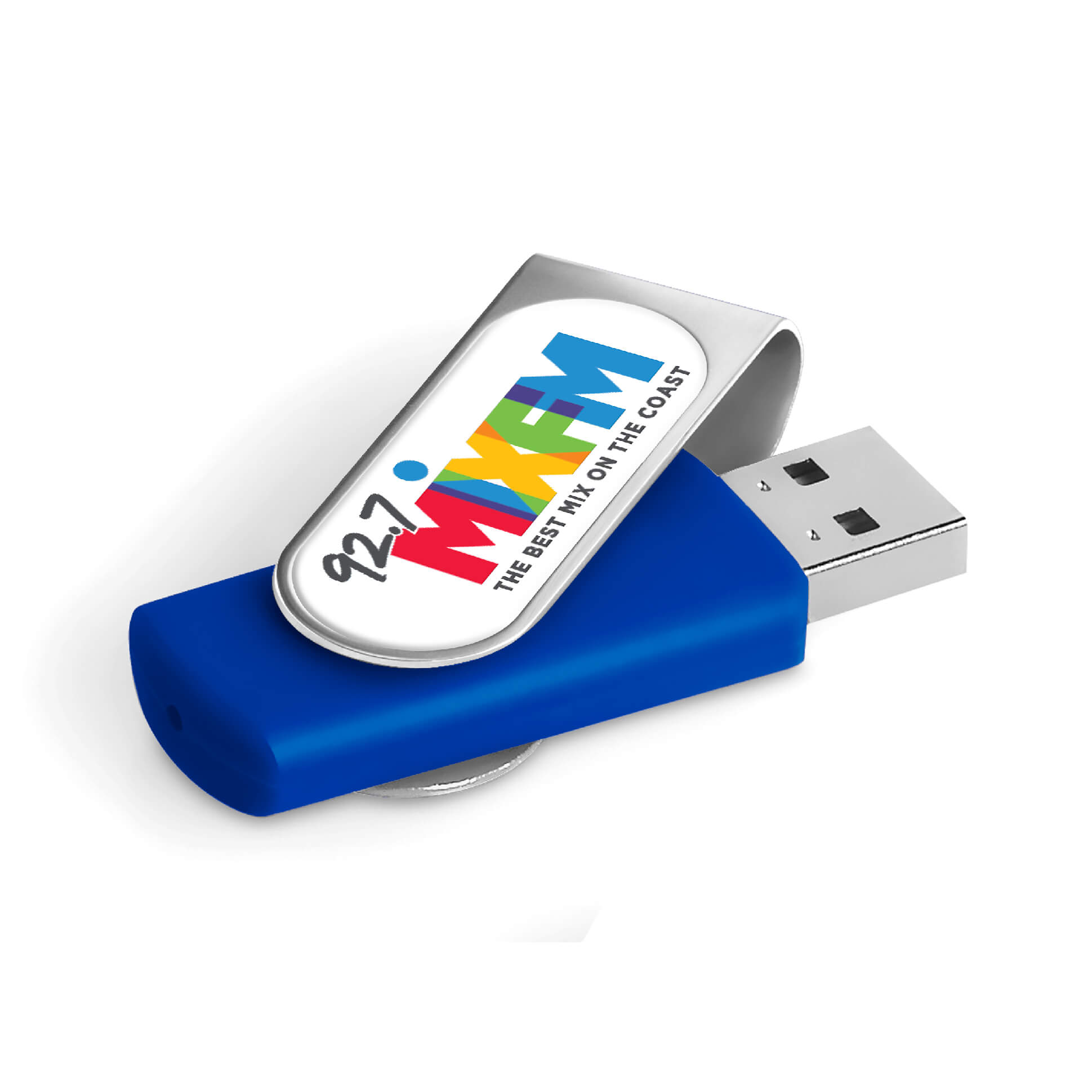 Classic flash drive with a silver metal swivel and a soft touch lacquered base. The swivel is designed for vibrant, full-colour dome sticker branding which fits snugly into the recess. It has 16GB of memory, with a USB 2.0 interface.