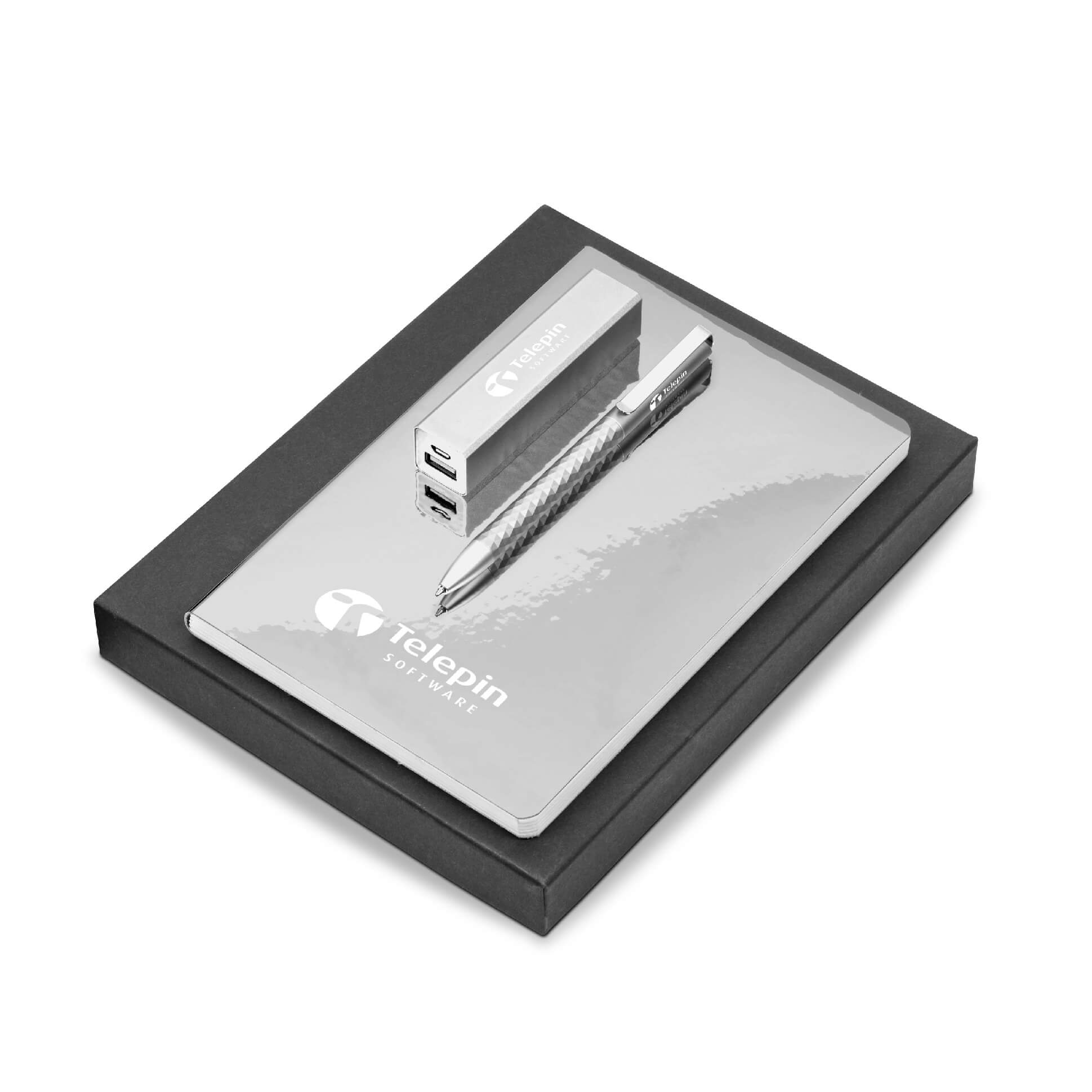 The Prestige Two Gift Set includes a Reflections A5 Notebook, Odeon Executive 2200mAh Power Bank & Vega Ball Pen